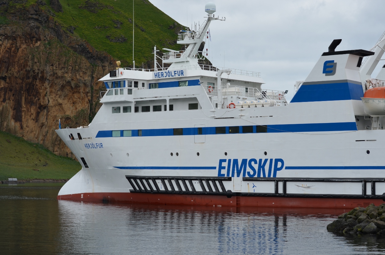Le port d’embarquement est limité à sa plus simple expression: Le terminal du Herjolfur, ferry qui assure, en 35 mn, les rotations vers Heimey, la principale île de l’archipel.