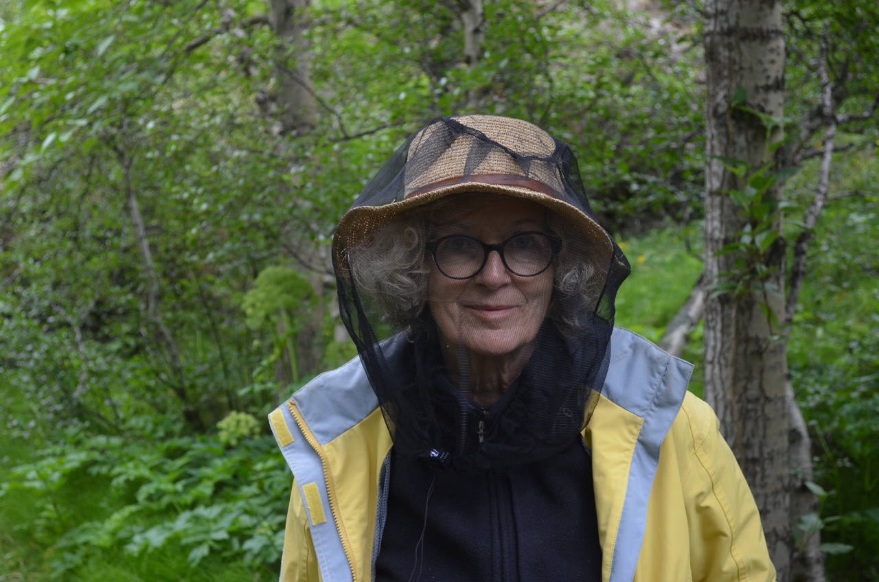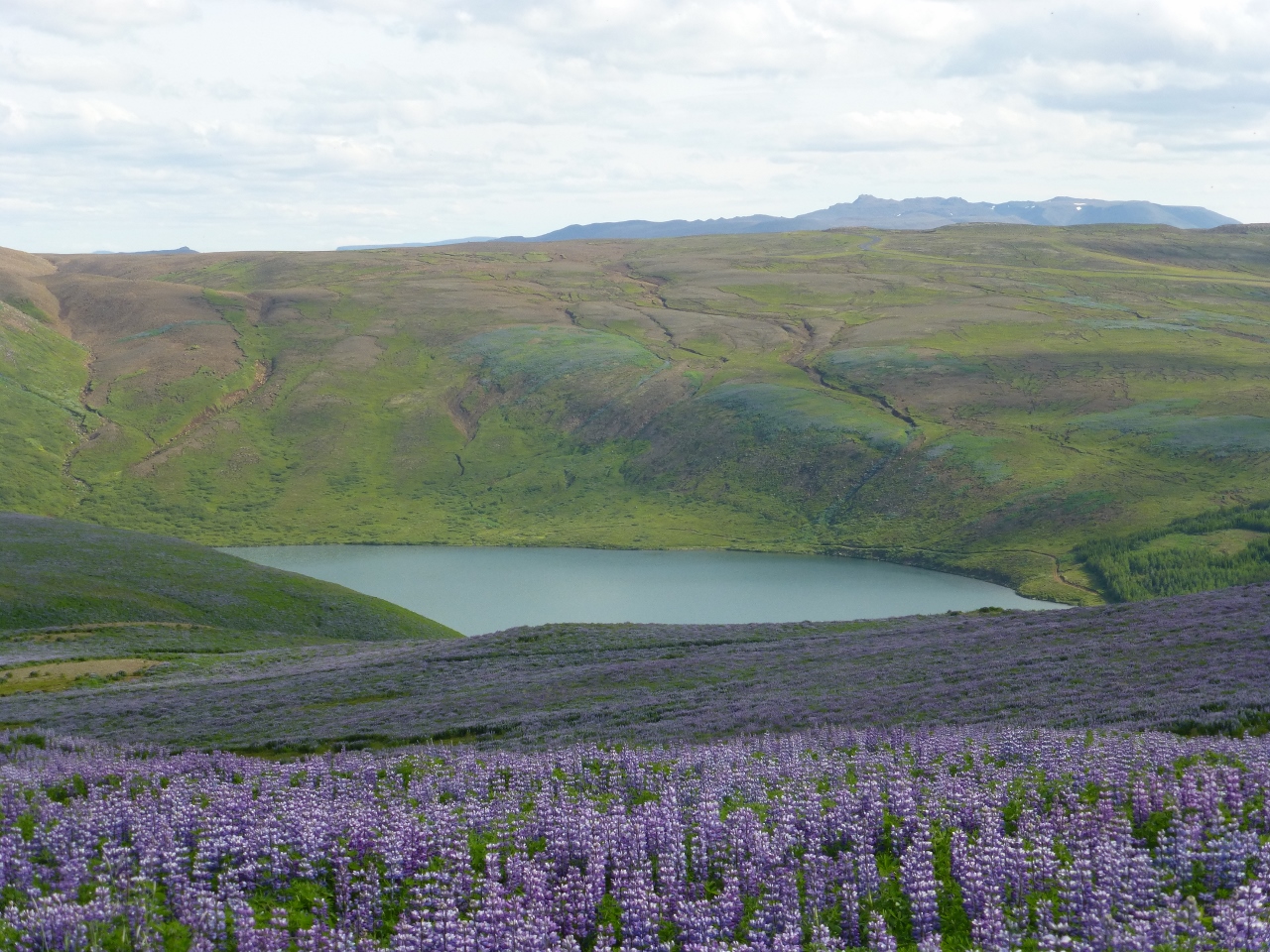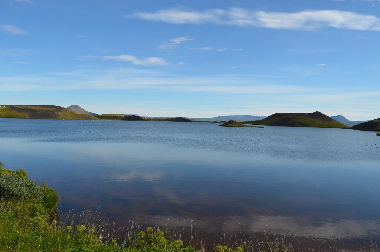 Ce lac de 37 km² s’est crée il y 2500 ans au coeur d’une zone volcanique riche en cratères, solfatare, champs de lave et chaos divers. Sa faible altitude en a rendu ses rives exploitables pour l’élevage. La collecte des œufs  et les truites du lac ont permis de compléter, pour fixer la population. La région, totalement isolée jusqu’en 1930 s’est, avec la construction de routes, ouverte au monde. Elle est devenue le lieu le plus fréquenté d’Islande et elle le mérite. Outre ses paysages, sa géologie, elle abrite une grande variété d’oiseaux dont une quinzaine de canards. Pas par hasard, ils sont friands des 45 espèces de mouches qui ne se font pas oublier ! Pour notre confort, sinon pour notre élégance, nous trouverons des moustiquaires, qui donnent à Agnès un petit air d’apicultrice.