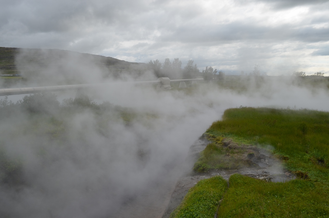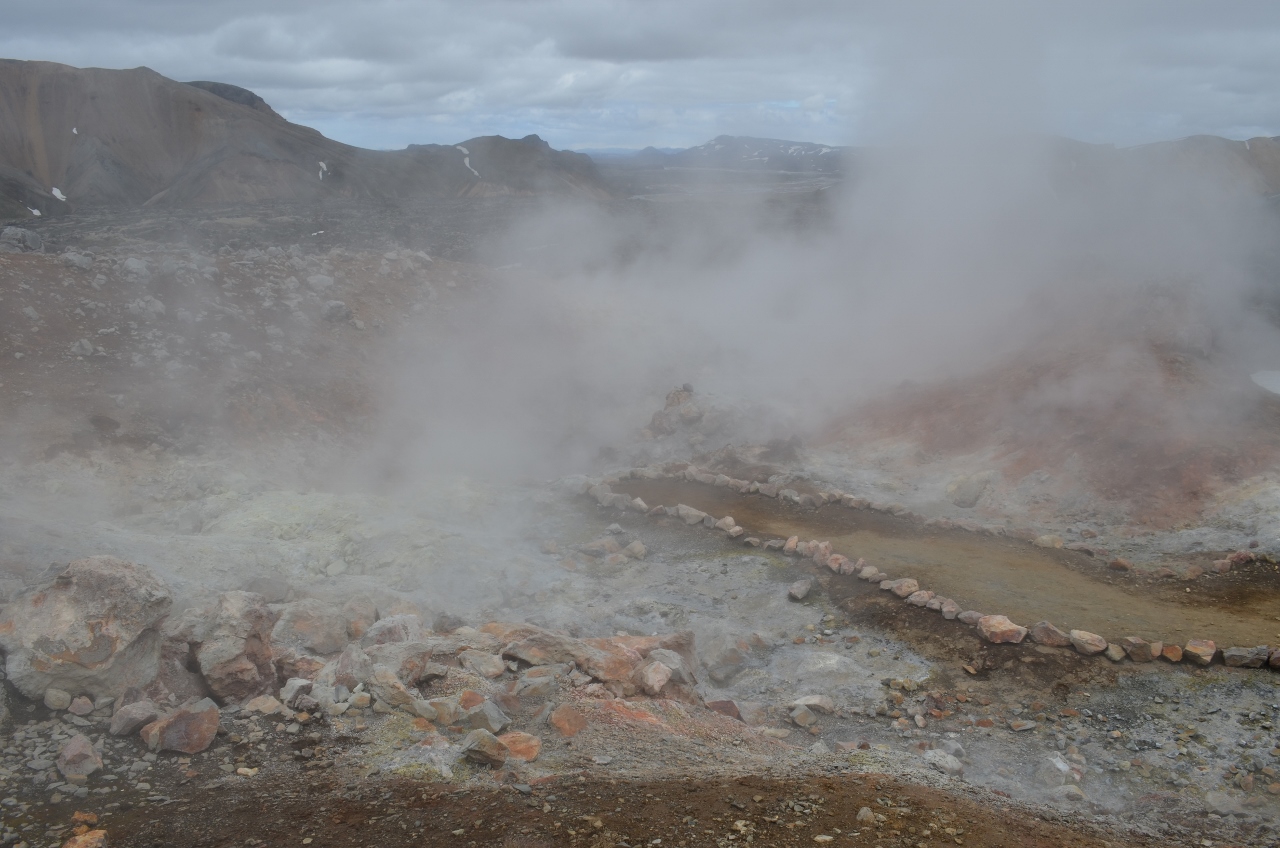 De là des sentiers très aménagés conduisent aux zones d’activité géothermiques. Des fumerolles s’échappent des berges de la rivière, créant une atmosphère irréelle.