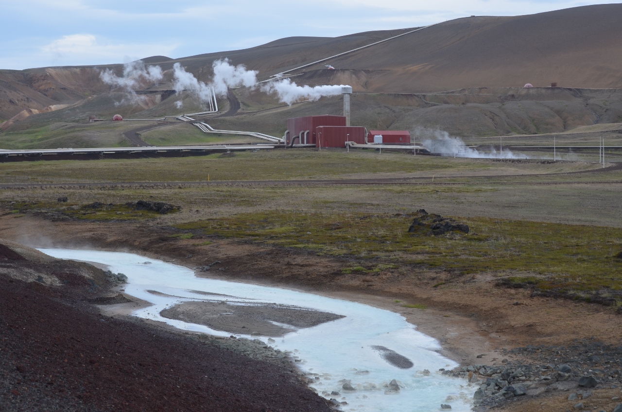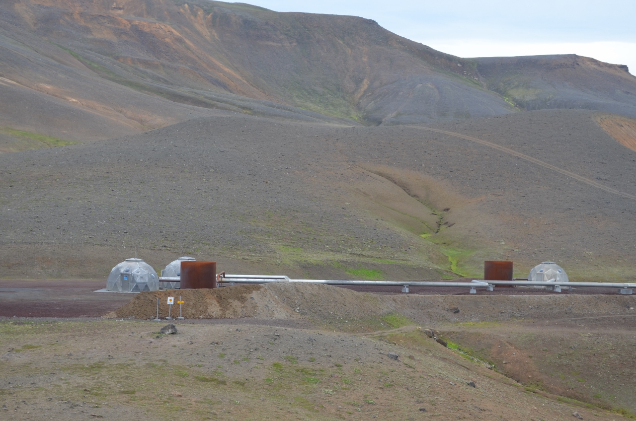 Visite de la 1° centrale géothermique d’Islande, 60 MW sur 2 turbines alimentées par 42 forages dont une vingtaine actifs, à 2000 m de profondeur tout de même, pour y capter l’eau surchauffée à 200°C  (tous ces chiffres, et d’autres, sur les panneaux d’info) La zone est quadrillée de canalisations reliant les forages à la centrale, les têtes de puits étant abritées sous de futuristes  dômes en alu.