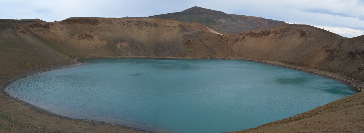 Les pseudos cratères au petit matin pour profiter du soleil, le chaos de  Dymmuborgir, les piliers émergeant des eaux à Hofdi , le lac bleu, en fait déversoir d’une source chaude, les solfatare de Hverir avec leurs marmites en ébullition, leurs chaudières et leurs pots à boues, le cratère du Hverfell, véritable entonnoir de cendres, tout nous enchantera.