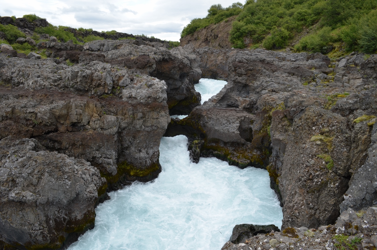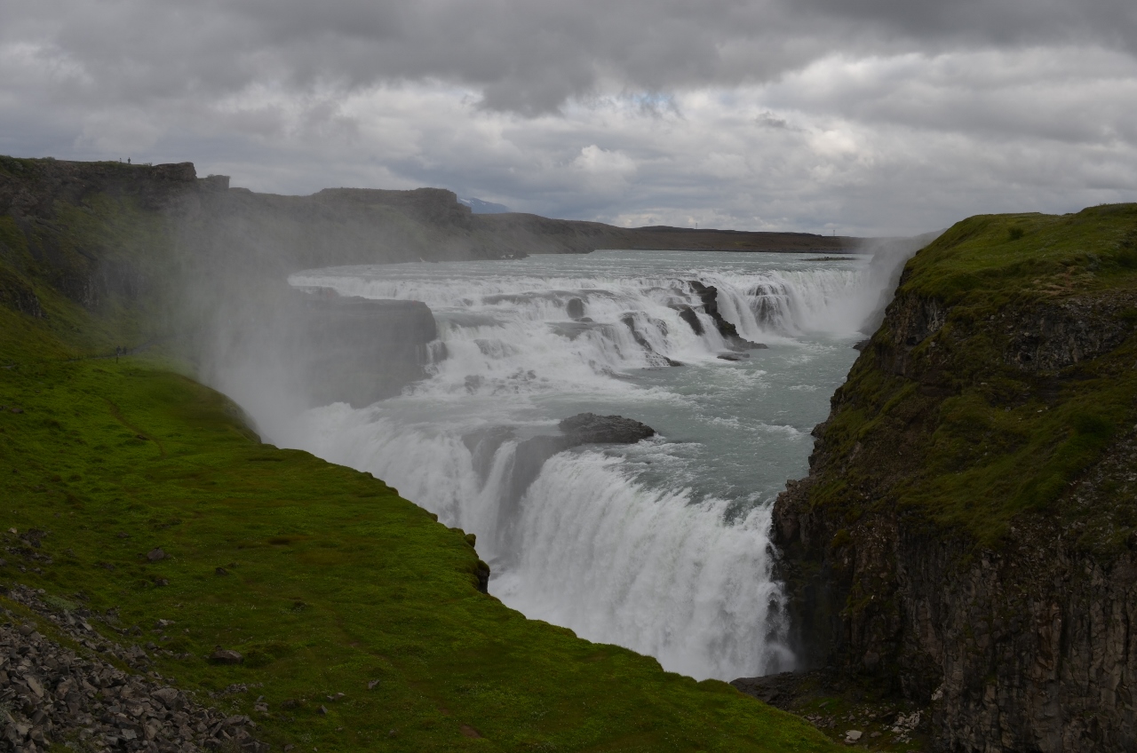 Direction NE par la route 30 pour atteindre les chutes de Gulfoss. Elles valent le détour : 31 m de haut, des gorges de 2.5km, un débit de 100 m3/s qui peut monter à 2000 en période de crue.. On y vénère la mémoire de la fermière, Jeanne d’Arc locale, qui fit, au début du siècle dernier, échouer les projets de construction d’un barrage projeté par des « intérêts étrangers » (damned, Brits again !!), au cours du combat d’une vie.