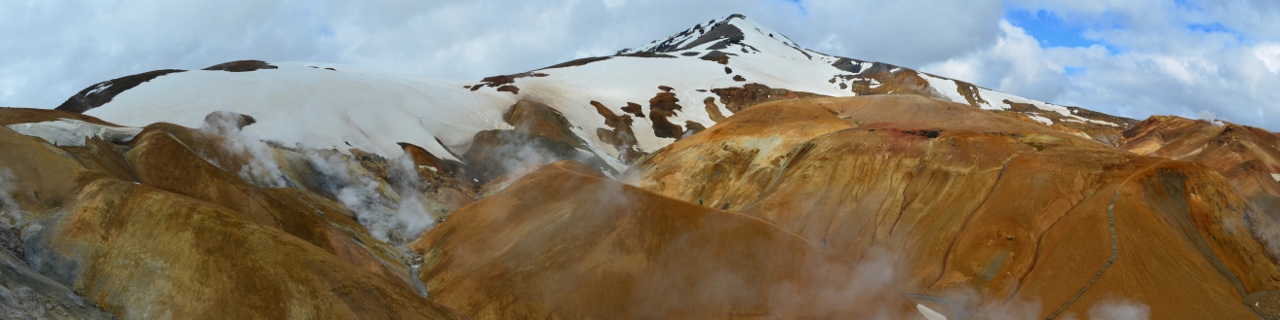 Au fond des combes entre les pitons; des marmites bouillonnent ça et là, le tout dans des pierriers dont les couleurs varient de l’ocre au beige. Et en Islande, quand le ciel est bleu, ce qui est rare, il est bleu ! : Somptueux.