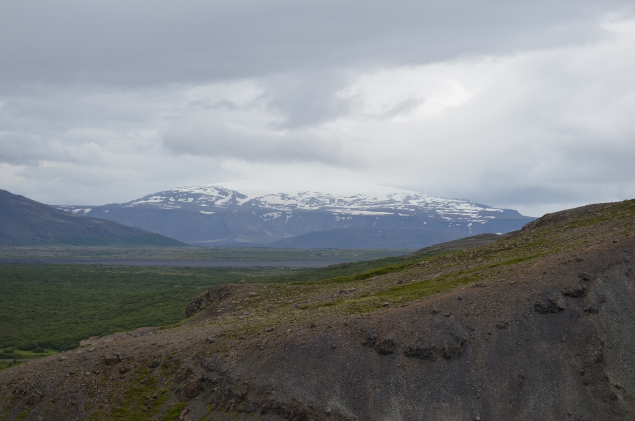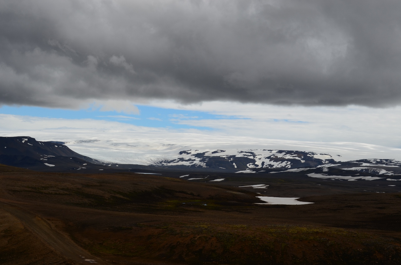 A la descente, vue, très loin, sur le Langjokull. Profitons en, c’est sans doute notre dernier glacier.