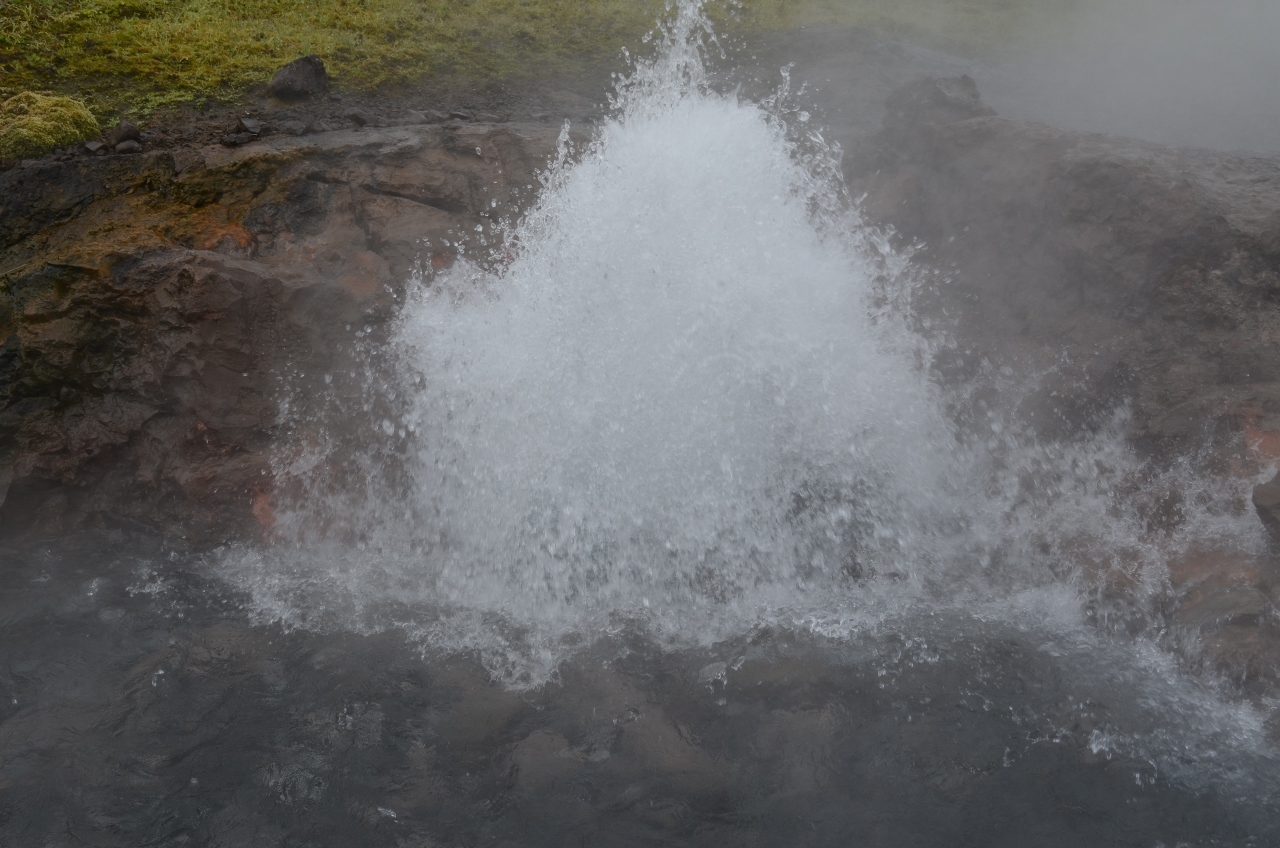 Route 35: le retour, comme souvent, nous parait bien plus rapide. Nous poussons jusqu’à Geysir, lieu où se produisent les phénomènes qui ont donné leur nom aux geysers. Sur place, le vieux Geysir , qui crachait jusqu’à 60m lors de périodes post sismiques ne s’exprime plus (jusqu’à quand ?) A deux pas le Strokkur a pris la relève et émet toutes les 5 à 10mn un panache d’une vingtaine de m. Il faut voir, en cercle, les touristes le doigt sur le déclencheur, attendant le phénomène, qui ne prévient pas. 10mn, c’est bien long…