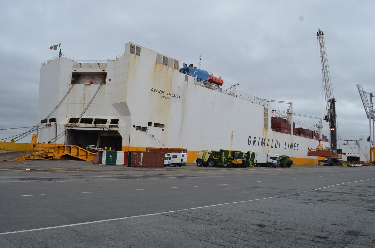 Grilles franchies, le « Grande America » est bien là, face aux piles de containers. Cargo mixte containers et Ro/Ro (Roll in / Roll out) de 230m et 56 000 tonnes, les traces de rouille accusent bien ses 20 ans.