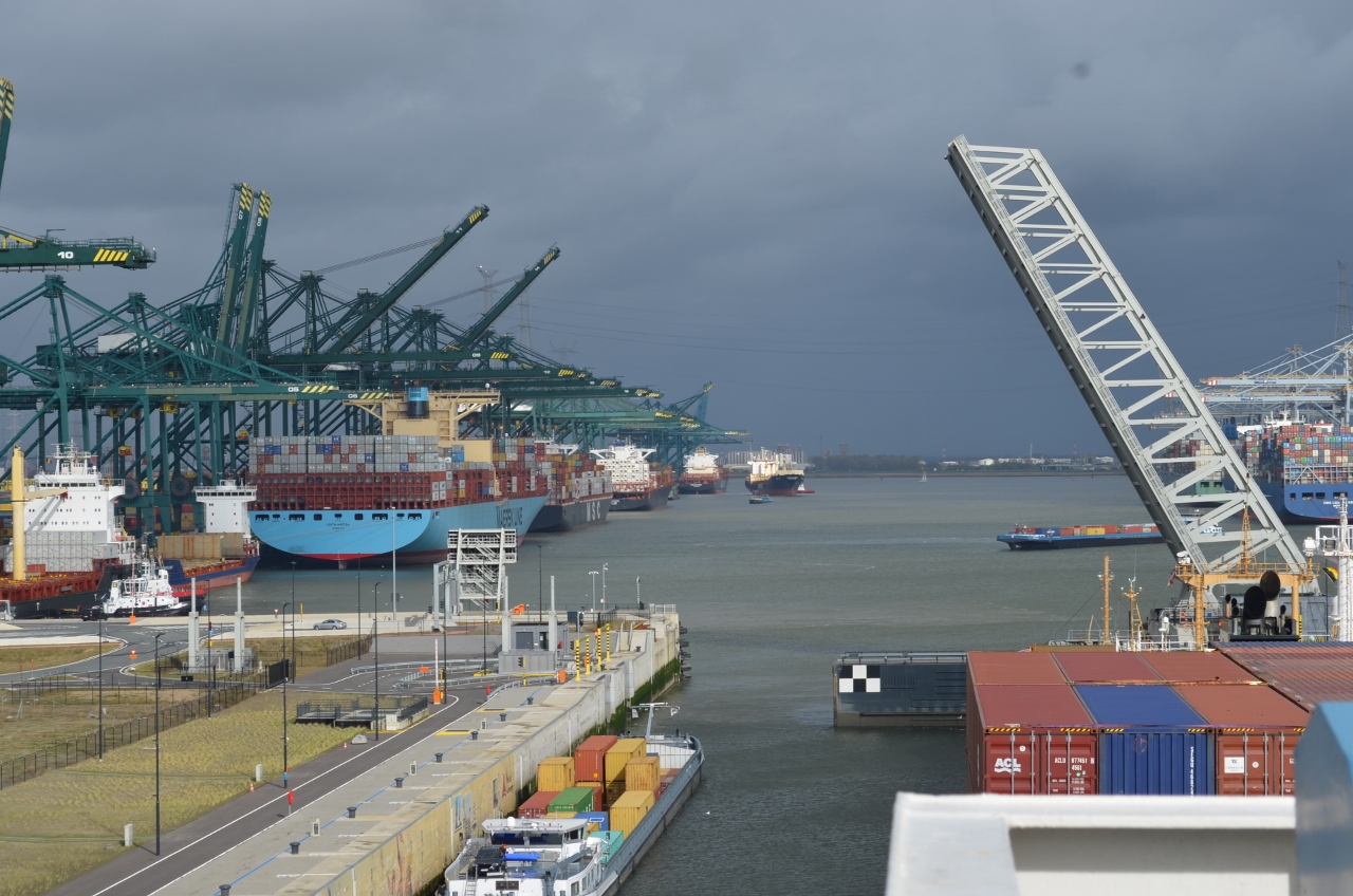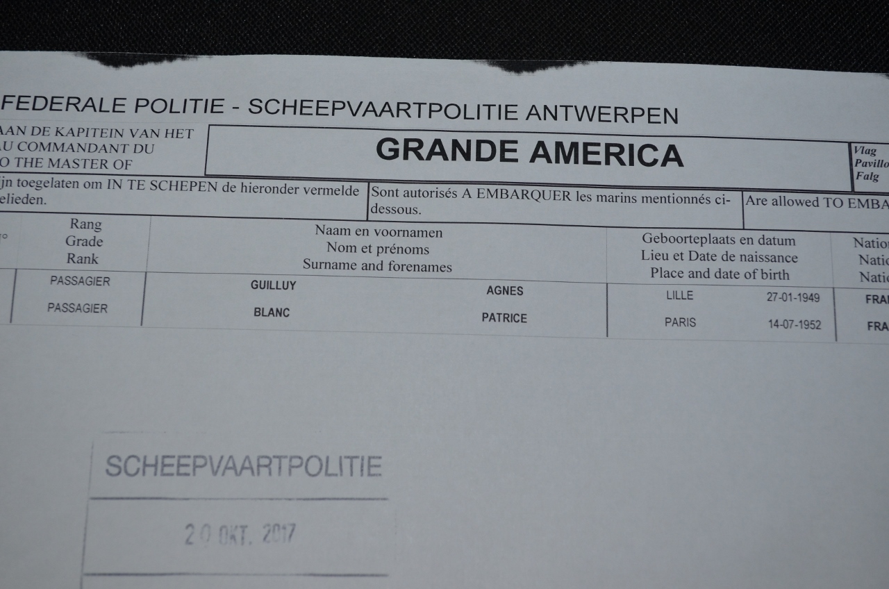 Immensité du port d’Anvers où sans GPS, jamais nous ne trouverions le poste de police pour le contrôle de sortie « Schengen ». Le fonctionnaire, aimable, s’excuse pour l’attente et nous remet le document ad hoc. Nous voilà transformés en matelots !!