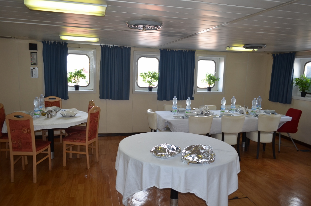 Les passagers sont à des tables spécifiques, un jeune « cameriere » italien, Alfredo, qui vient de prendre ses fonctions à bord, assure notre service, rapidement cadré par le commandant qui veille à ce que nous ayons une bonne prestation. Quand il lui ordonnera de nous servir un quart de vin à chaque repas, Alfredo insistera pour que nous emmenions en cabine les bouteilles non consommées : « Il commandante a detto che dovete avere una bottiglia per pranzo… ».