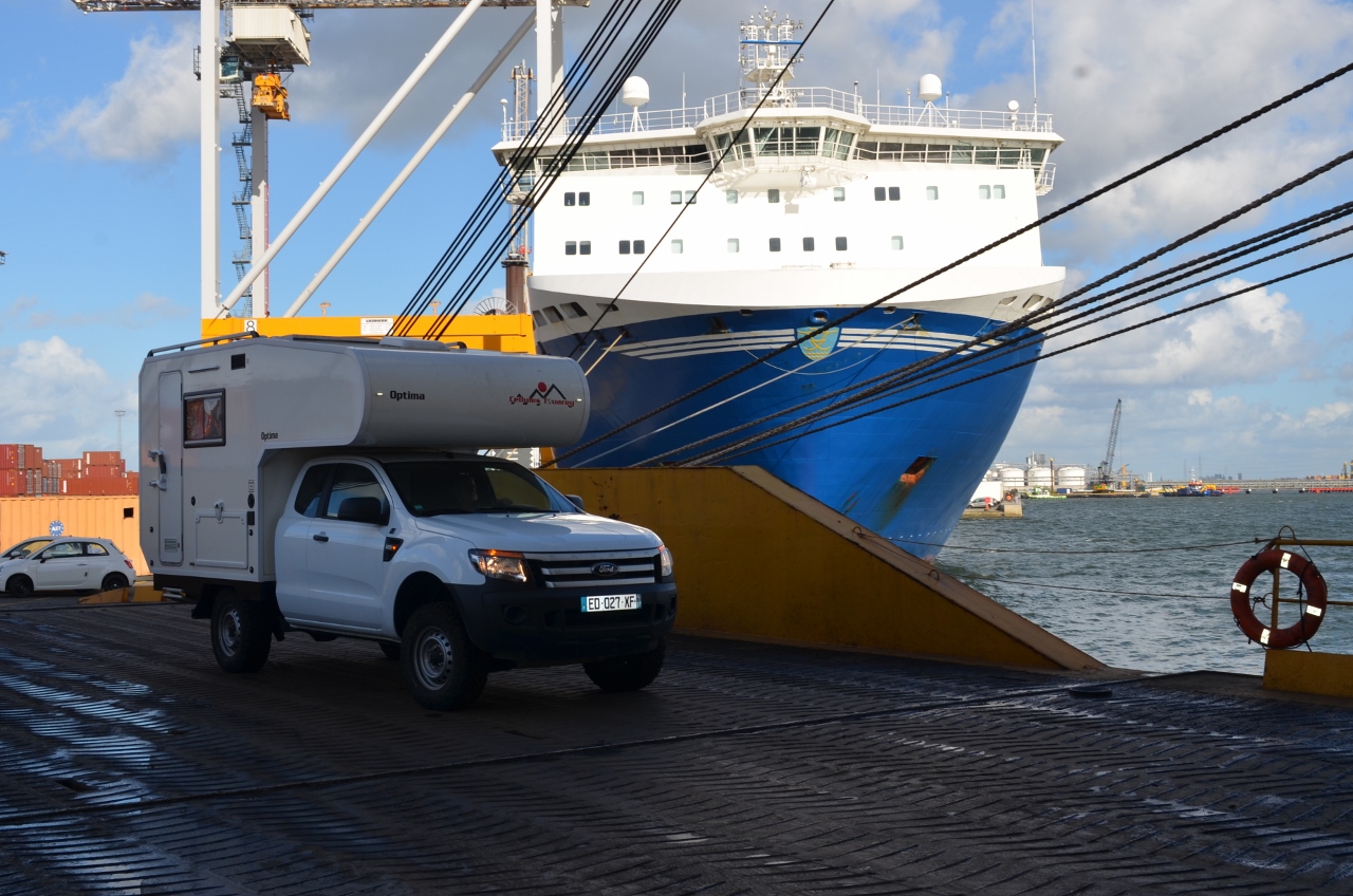 Nous le conduirons à bord, en dernier semble-t-il, samedi après midi. Aucun contrôle, ni dimensionnel, ni contenu. Si j’aurais su, comme disait p’tit Gibus, j’aurais fait le plein de GPL, pour nous épargner les futures recherches de station en Uruguay. Je n’aurais pas, non plus et pour 20 cm de trop, démonté le coffre extérieur afin de rester dans le tarif….