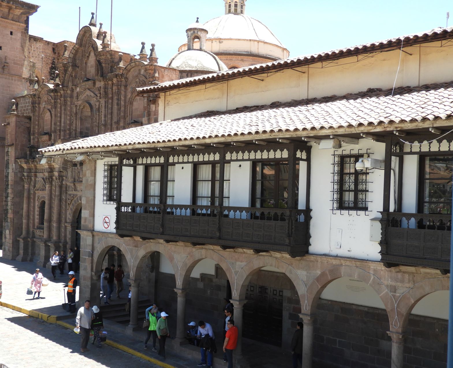 - Nous admirerons la vaste place d’armes, bordée de maisons coloniales aux arcades ombragées avec, sur un des côtés, la cathédrale, flanquée des églises « del Triunfo » et « Jesus Maria », et sur le pan mitoyen, l’église jésuite. Leur proximité, ou leur antagonisme? fait sens.