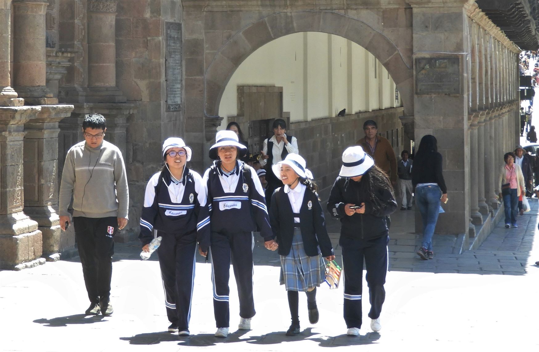 Mais Cuzco, ce ne sont pas que des vestiges et des églises, c’est aussi une ville qui vit, que l’on gagne en dévalant les ruelles où subsistent des cactus sur les murs en adobe (c’est mieux que des tessons de bouteille), où les métiers à tisser, même les plus simples, sont en production, où les jus de fruits sont toujours frais, où les enfants, comme dans tous les pays d’Amérique du Sud, vont à l’école en uniforme british, où les motards de la police, en tenue US, pour peu qu’on leur demande gentiment de prendre la pose, savent aussi sourire, et où les forces de sécurité marquent le pas à la mode allemande.