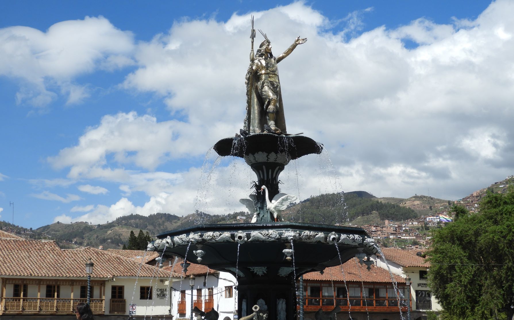 Au centre de la place, l’Inca Atahulpa, martyr des espagnols à 31 ans, continue à montrer la voie…