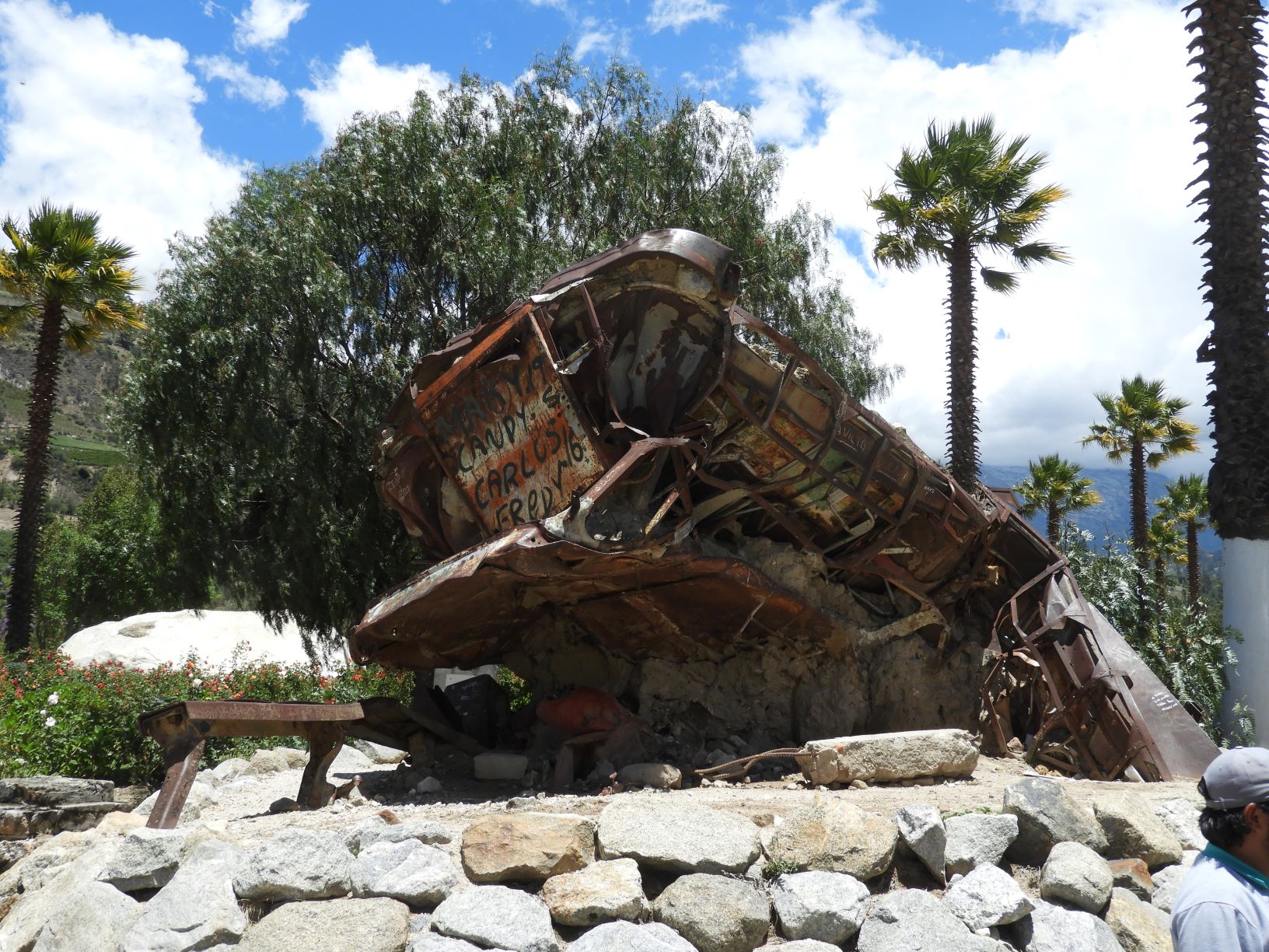 Route nord -ouest vers Huancayo, belle route bien large, et bien pentue. Si pentue que le conducteur d’une semi-remorque circulant en sens inverse en a perdu le contrôle dans la descente, a traversé la chaussée et s’est retourné dans le fossé de la voie montante, quelques instants avant notre passage, la police vient tout juste d’arriver.
